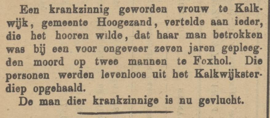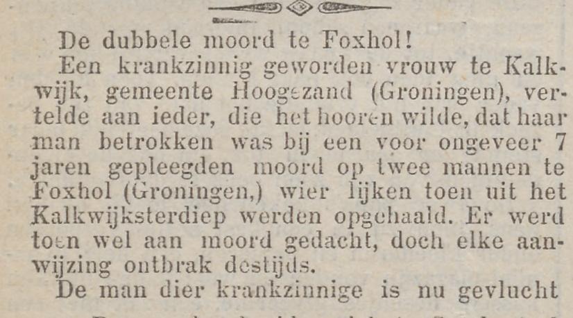 Maar een kleine zeven jaar later meldde zich een ‘krankzinnig geworden vrouw’ die beweerde dat haar man bij de ‘moord’ betrokken was. De man vluchtte. Hoe het verder ging en of er ooit een dader veroordeeld werd, is (nog) in de geschiedenis verborgen.