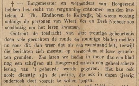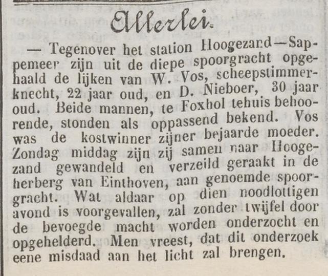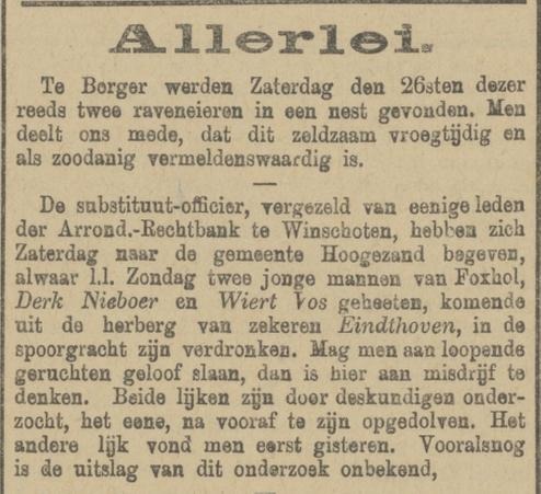 Twee jonge mannen, Wiert Vos en Derk Nieboer, verdronken in de spoorgracht in Hoogezand. Ze kwamen uit een herberg, op een noodlottige zondagmiddag in 1887. Er werd verwacht dat er een misdrijf aan ten grondslag lag en dat zou worden onderzocht. Blijkbaar kwam daar niets relevants uit, alhoewel de geruchtenmachine volop draaide.
