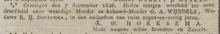 Grietje Wijndels is volgens de overlijdensakte overleden op 07-09-1826 te Groningen in het huis aan de Noorderhaven nr. 62, aangifte werd gedaan door Arnoldus Willem Hoeksema (zoon), negociant en Jan Arnold Engelhard (schoonzoon) lid van de rechtbank in Groningen.