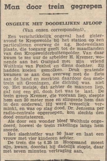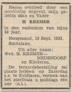 Henderik (Hendrik) Kremer was 48 jaar oud op 19-09-1933 toen hij zo tragisch aan zijn einde kwam. Hij was boerenarbeider en ongetwijfeld als zodanig aan de slag in de polder. Henderik was geboren 28-10-1884 te Annerveen (Anloo), als zesde kind van een al wat oudere vader (51) en een tien jaar jongere moeder, Geert Kremer en Lena Tonnis.